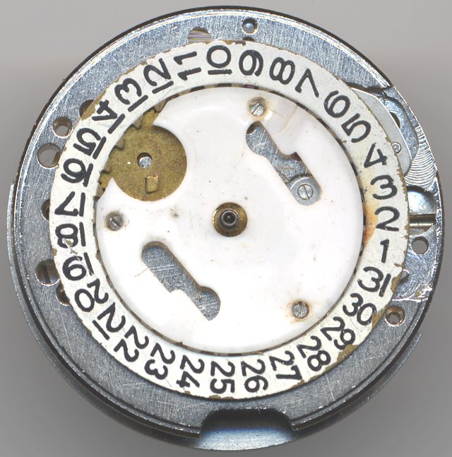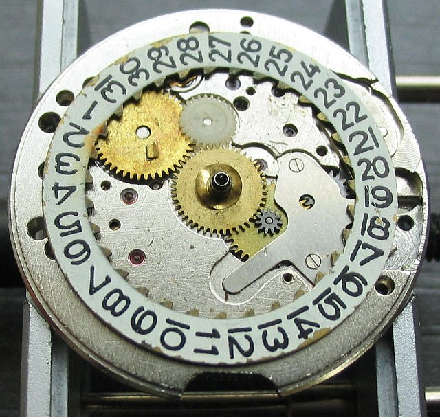 Der Datumsmechanismus liegt leider unter einer Plastikabdeckung. “Leider” deswegen, weil Plastik mit der Zeit altert, spröde wird und dann ausbricht. Auf dem Foto kann man dies am Bereich der Schrauben gut erkennen.