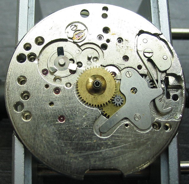 Natürlich besitzt dieses Werk einen Kupplungsaufzug. Am linken unteren Ende der Winkelhebelbrücke kann man die Lagerung der Federhauswelle erahnen. Wenn man die Brücke und die Welle entfernt, kann das Federhaus aus dem Werk gezogen werden.