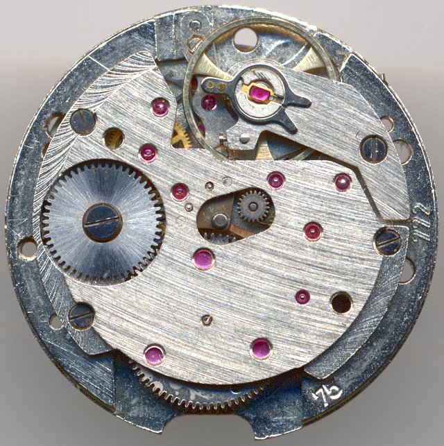 Das Zeitanzeige-Werk ist recht modern konstruiert, es besitzt bereits ein indirekt angetriebenes Minutenrad und eine indirekt angetriebene Zentralsekunde. Auf diese Weise steht mehr Platz für die recht große Glucydur-Unruh (drei Speichen, schraubenlos) und für das einseitig fliegend (unter drei Lagersteinen) gelagerte Federhaus zur Verfügung.