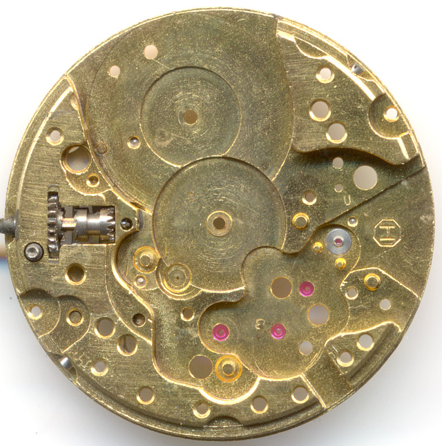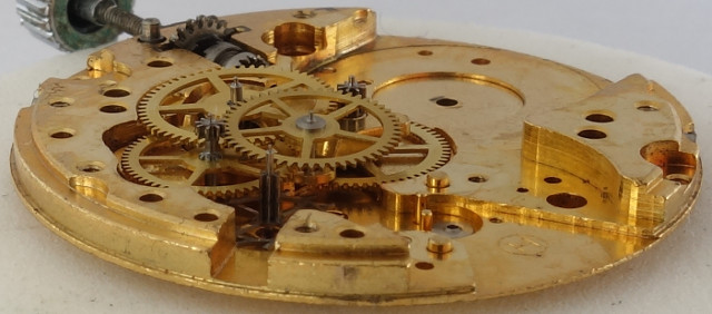 Interessant ist bei diesem Werk auch, dass das Gesperr offen gelagert ist, und erst mit der Abdeckplatine fixiert wird. Vermutlich liessen sich damit ein paar Zehntelmillimeter Dicke einsparen, was seinerzeit in den 1950er Jahren durchaus ein wichtiges Verkaufsargument war.