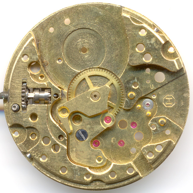 Das Helvetia 830 ist ein Handaufzugswerk mit 11 1/2 Linien Durchmesser und einem sehr ungewöhnlich konstruierten Räderwerk. Durch seine Bauform mit abgeschrägten Kloben und Brücken konnte man wertvolle Zehntelmillimeter Bauhöhe einsparen.