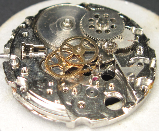 Beim HMT 6906 mit seinem klassischen Räderwerksaufbau sind nicht nur Sekundenrad, Kleinbodenrad und Ankerrad unter der großen Räderwerksbrücke gelagert, sondern auch noch das Federhaus, sowie die beiden Reduktionsräder des Automaticaufzugs. Servicefreundlich ist anders…