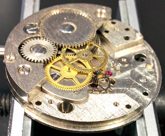 Man erkennt sehr gut, daß alle Räder, sogar das Minutenrad, steingelagert sind. Lediglich das Federhauslager wurde steinlos gelassen.