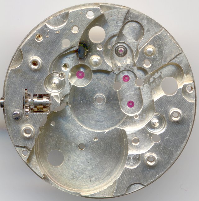 Das Minutenrad wird - für damalige Verhältnisse modern - unter einer eigenen Brücke gelagert; um das konzentrisch laufende Sekundentrieb optimal zu lagern wurde ein loser(!) Lagerstein auf die Brücke gelegt.