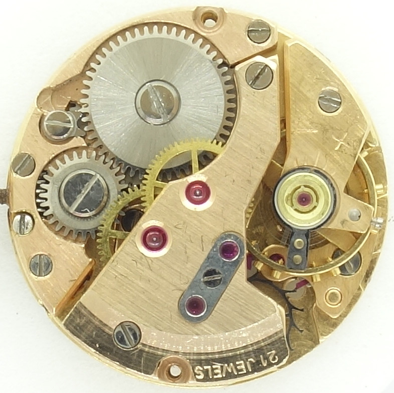 Auf den ersten Blick erscheint dieses 21-steinige Werk recht normal, dennoch ist schon die Anordnung der vier, mit roten Rubinen ausgestatteten Lagern auf der Grundplatine ungewöhnlich. Nicht weniger interessant ist der durchsichtige Lagerstein in einer verschraubten Fassung bei 8 Uhr.