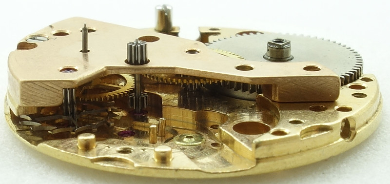 Zifferblattseitig ist dieses Werk recht unspektakulär. Es verwendet erwartungsgemäß einen Kupplungsaufzug und man kann bei 9 Uhr sehr schön die dreischenklige Stoßsicherung samt Messinglager erkennen.