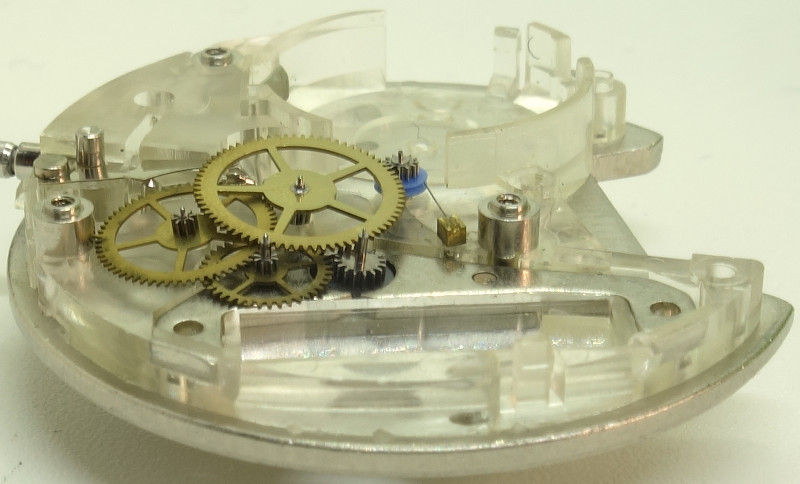 Das zentrale Minutenrad befindet sich direkt auf der Grundplatine, alle anderen Räder sind in einer Art Plastikkapsel geschützt, die zwischen die Pfeiler des Werk-Skeletts gesteckt wird.