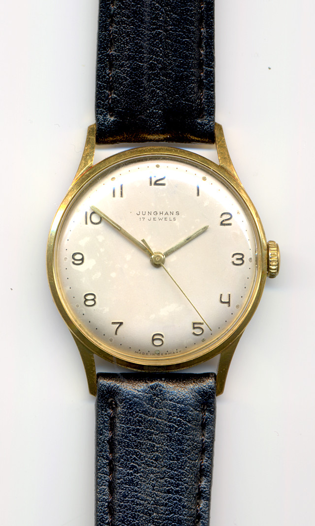 Anders, als die meisten gängigen Junghans-Werke hat es die “volle” Herrenuhrwerksgröße von 11 1/2 Linien. Wegen der dadurch sehr groß ausgefallenen Unruh (und auch, weil es seinerzeit noch Usus war) tickt es gemächlich mit 18000 Halbschwingungen pro Stunde.