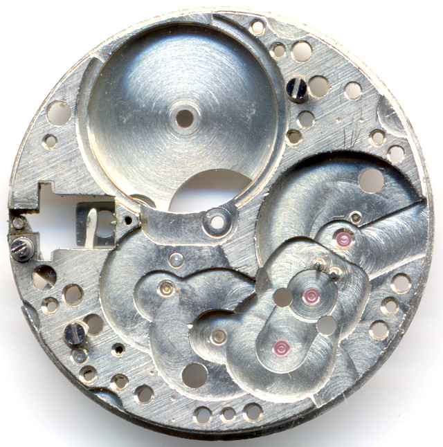 Die Grundplatine war in früheren Ausführungen noch messingfarbig, und wurde dann später silberfarbig. Dort erkennt man ein reinrassiges Ankerwerk, bei dem alle Lager mit Steinen ausgestattet sind, beim Sekunden- und Kleinbodenrad sind diese durchsichtig.