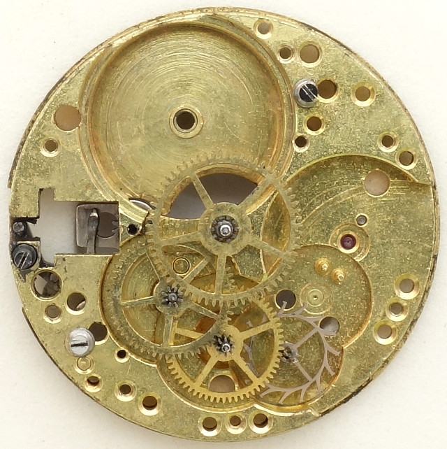 Der Räderwerksaufbau ist ganz typisch für die damalige Zeit: Das Federhaus treibt das zentrale Minutenrad an, gefolgt vom Kleinbodenrad, Sekundenrad auf 6 Uhr und Stahl-Ankerrad.
