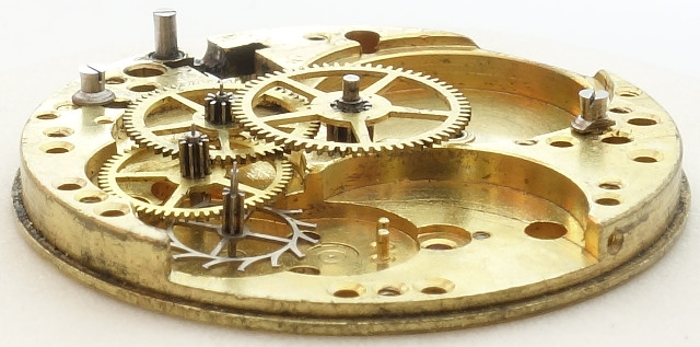 Schon die gelb gebrannte Grundplatine schickt einen in die 30er Jahre zurück. Damals war es auch noch üblich, dass preiswerte Werke mit wenig bis keinen Lagersteinen ausgestattet waren. Das Junghans J80 macht in der hier gezeigten, einfachsten Ausführung keine Ausnahme, lediglich die Unruhwelle ist steingelagert, ansonsten findet man nur Messinglager vor.