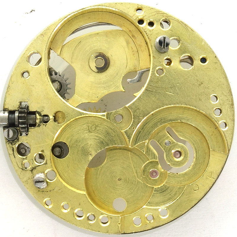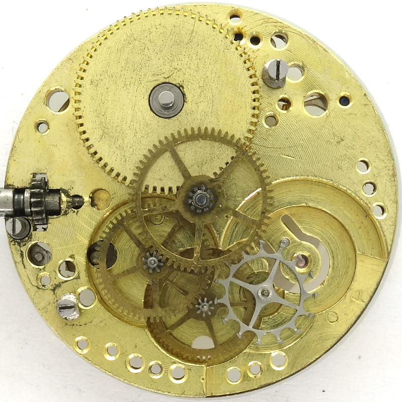Der Aufbau des Räderwerks ist typisch für ein Zylinderwerk: Das Federhaus treibt das zentrale Minutenrad an, gefolgt vom Kleinbodenrad, Sekundenrad auf 6 Uhr und dem Stahl-Zylinderrad.