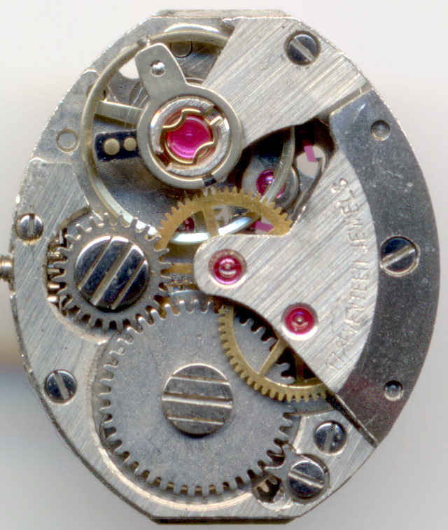 Die Grundplatine dieses 17-steinigen Werks zeigt eine Besonderheit: Es sind alle wichtigen Lager mit Steinen ausgestattet ausgenommen Minutenrad und Federhaus. Soweit nichts besonderes, interessant ist aber, daß das zifferblattseitige Wechselrad steingelagert ist. Was es mit diesem ungewöhnlichen Detail auf sich hat, darüber kann man nur spekulieren.