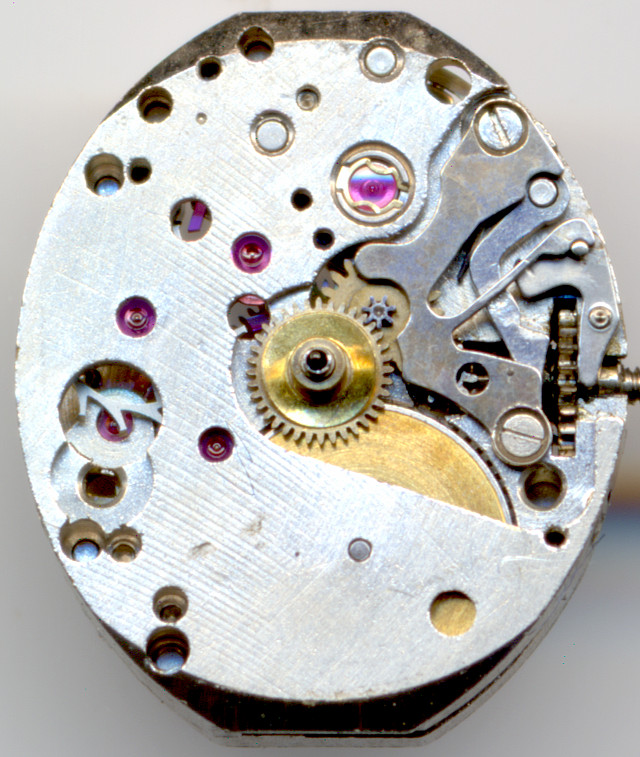 Auf der Zifferblattseite findet man das gewohnte Bild praktisch aller 5 1/2 linigen Formwerke vor: Oben das Incabloc-Lager der Unruh, links das Ankerrad mit Aussparungen für den Anker, dessen Ausgangspalette dadurch zifferblattseitig leicht geölt werden kann. Unten die relativ große Aussparung für das Federhaus und bei 3 Uhr dann der Kupplungsaufzug.