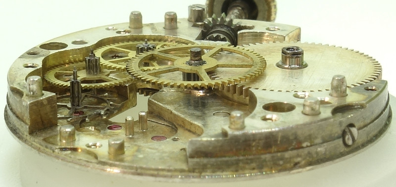 Kupplungsaufzug (hier leider mit unvollständiger Winkelhebelfeder) und die Hilfsminuterie für Justagezwecke sind gut zu erkennen.