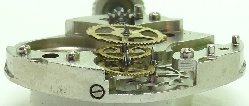 Zifferblattseitig erkennt man schön das große Ankerrad, und auch den Kupplungsaufzug.