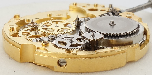 Das vom Federhaus direkt angetriebene zentrale Minutenrad ist unter einer eigenen Brücke gelagert, auf deren Oberseite sich das indirekt angetriebe Zentralsekundentrieb befindet. Durch eine Feder, die es Richtung Werksseite drückt, wird es am Flattern gehindert.