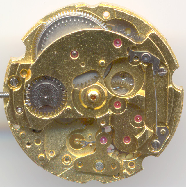 Wenn die Abdeckplatte der Zifferblattseite montiert ist, ist von der Datumsschaltung nicht mehr viel zu erkennen, ausser dem Schaltrad und dem Sternrad, welches die Wochentagsscheibe (das wäre dann das Werk 6T51) antreibt.