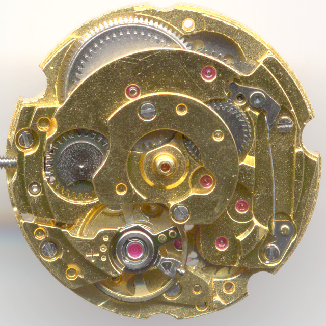 Schon die Grundplatine läßt erahnen, dass es sich hier um ein äußerst ausgereiftes und funktionssicheres Werk handelt. Nicht weniger als 21 Lagersteine wurden hier verbaut, selbst das zentrale Minutenrad ist steingelagert.