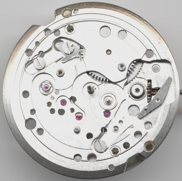 Auf der Zifferblattseite befindet sich das Gesperr - typisch für Werke mit preiswertem Wippenaufzug. Im Gegensatz zu vielen Billigwerken mit Wippenaufzug ist es hier aber sehr gut ausgeführt, mit doppelt verzahnter Sperrklinke.