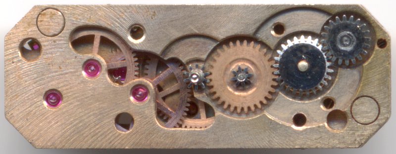 Auf den beiden folgenden Bildern kann man gut erkennen, daß sich das eigentliche Räderwerk, Sekunden- und Kleinbodenrad unter der Unruhpartie befinden. Nur das Ankerrad geht über die gesamte Werkhöhe, da es Hemmung und Räderwerk “verbindet”.