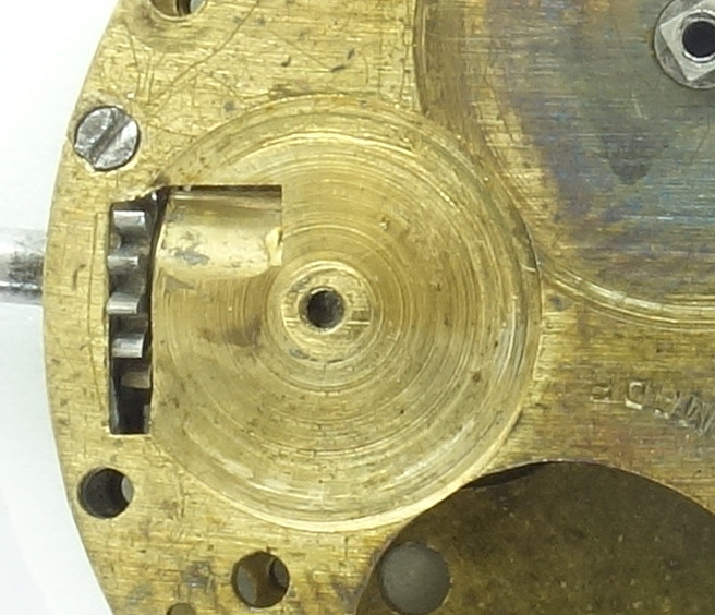 Wirklich kurios ist die Art und Weise, wie das Aufzugsrad in Position gehalten wird: Die Räderwerksbrücke wird im Bereich unterhalb des Kronrads geschlitzt und so nach unten gedrückt, dass das Aufzugsrad nicht verschoben werden kann: