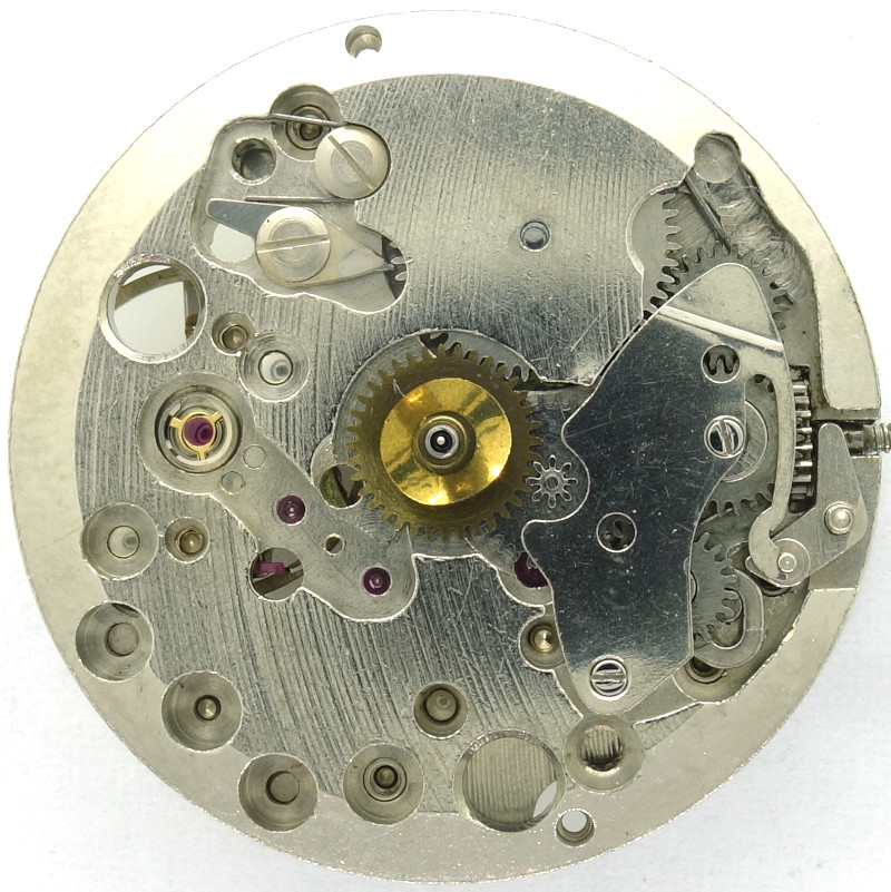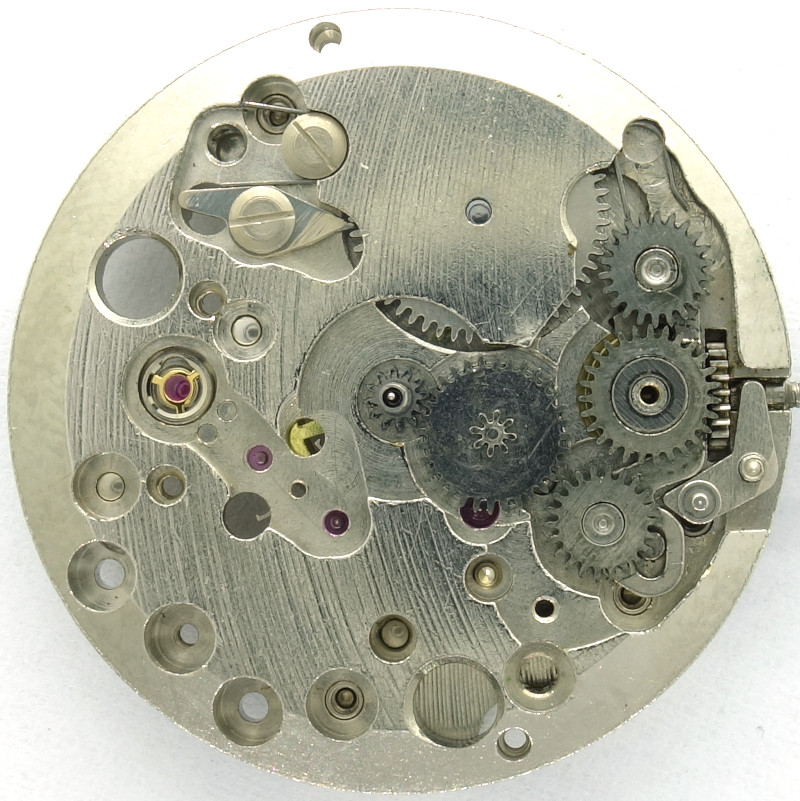 Der Wippenaufzug dreht sich hier nämlich nicht um das zentrale Rad, sondern er wird durch den Winkelhebel so seitlich verschoben, dass entweder das obere Aufzugsrad zum Eingriff in das zifferblattseitige Sperrrad kommt, oder das Zeigerstellrad in das Wechselrad eingreift.