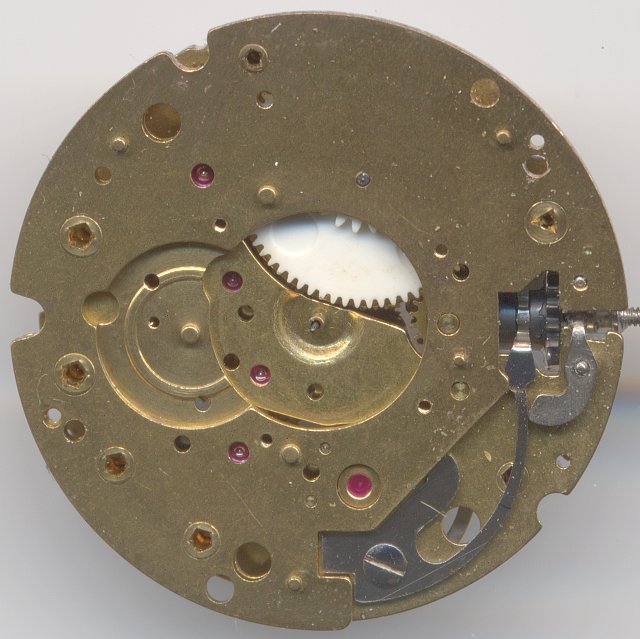 Zifferblattseitig findet man den, bei Stiftankerwerken häufig verwendeten Roskopf-Aufbau wieder mit dem Federhausrad (aus Plastik!), das gleichzeitig als Wechselrad verwendet wird. Minuten- und Stundenrohr werden hierbei indirekt angetrieben und können beide von der Zentrumsachse entfernt werden.
