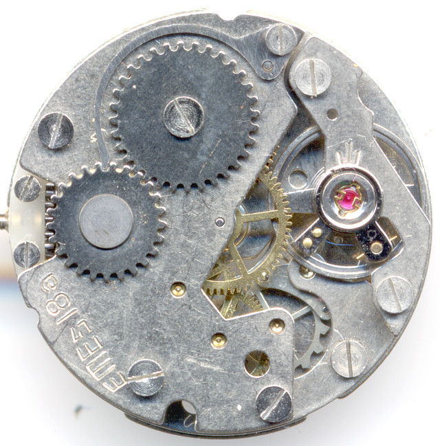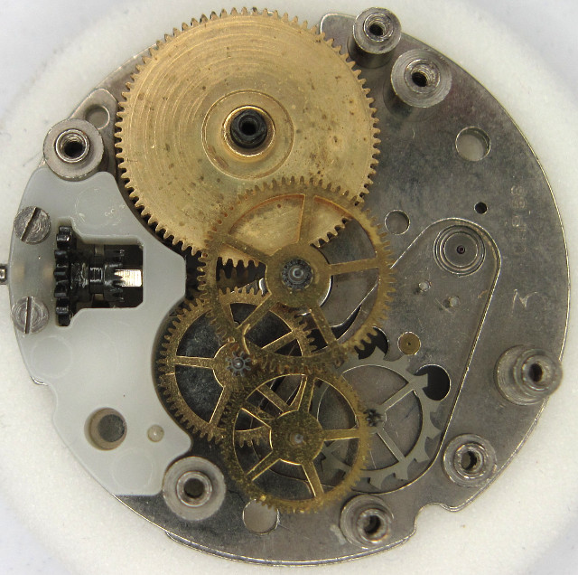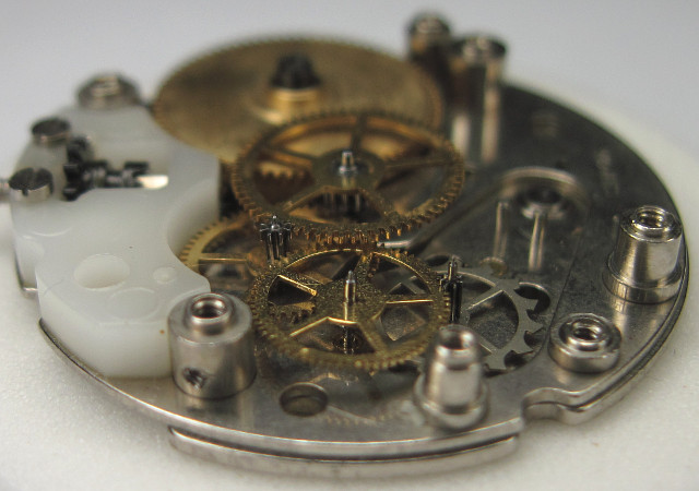 Die Aufzugspartie (immerhin ein Kupplungsaufzug) ist in einem Plastikkäfig gelagert, das Werk selbst ist eine Pfeilerkonstruktion und keines der Lager (ausgenommen die Unruhpartie) ist mit Steinen versehen, sondern besteht nur aus Messingbuchsen.