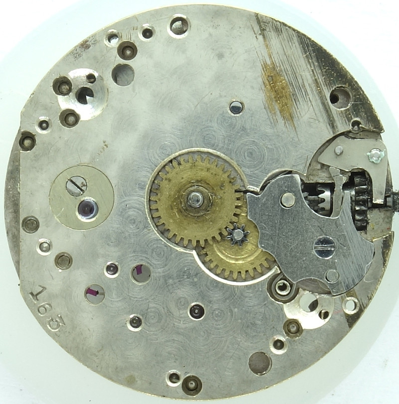 Die geschlitzte Bimetall-Schraubenunruh verrät, dass dieses Werk schon älteren Baujahrs ist (vermutlich stammt es aus den 1920er bis 1930er Jahren). Sie ist natürlich noch nicht stoßgesichert. Ihre Schlagzahl von 18000 Halbschwingungen pro Stunde kann mit Hilfe eines langes Rückerzeigers justiert werden.