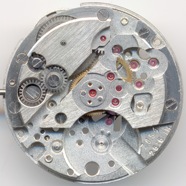 Die Grundplatine zeigt neben einer Vielzahl von Lagersteinen eine sehr ungewöhnliche Besonderheit: Zwischen dem zentralen Minutenrad und dem Federhaus befindet sich ein weiteres Übertragungsrad, dessen Lager nicht nur verschraubt ist, sondern ebenfalls einen Lagerstein enthält. Gleichzeitig ist es ein Indikator dafür, daß sich das Federhaus werksseitig gesehen im Gegenuhrzeigersinn dreht, und nicht, wie bei fast allen anderen Werken, im Uhrzeigersinn.