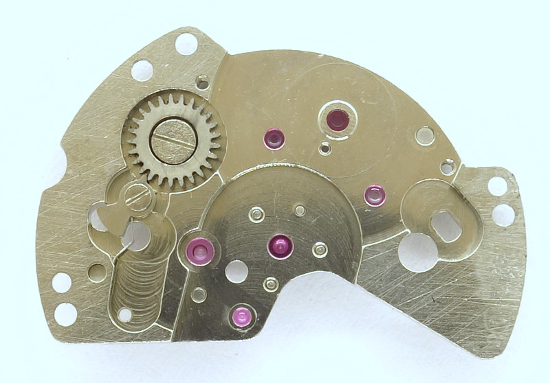 Eine Besonderheit der PUW-Automaticwerke ist, dass sich das Gesperr auf der Innenseite der Räderwerksbrücke befindet, und diese auch gleichzeitig das Federhaus lagert - natürlich auch steingelagert.