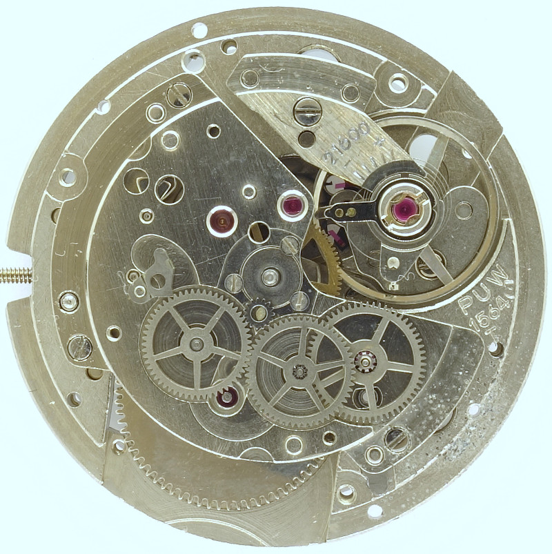 Der Durchmesser dieses Werks beträgt stolze 12 3/4 Linien, also 28,9mm. Sein kleinerer Zwilling mit nur 11 1/2 Linien (25,6mm) Durchmesser ist das ansonsten technisch identische PUW 1563T.