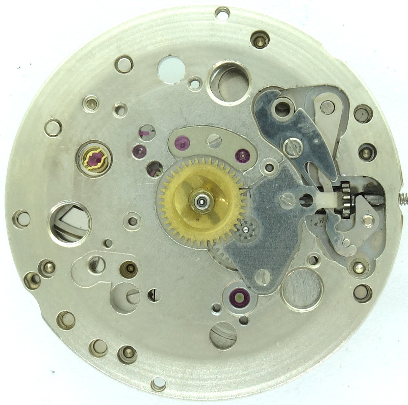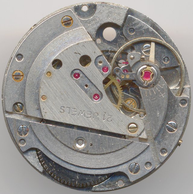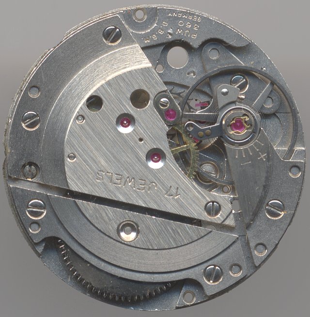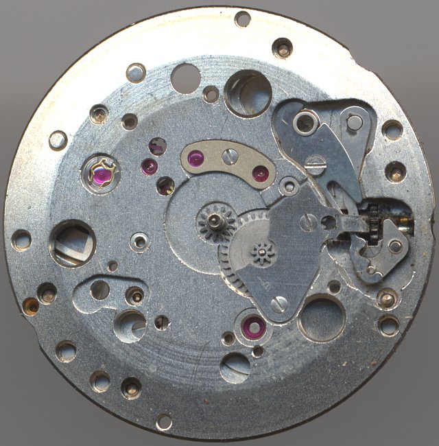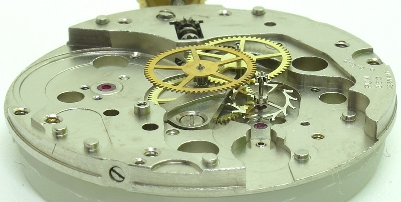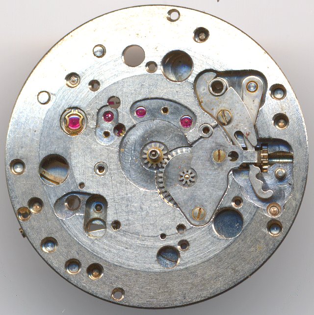 Die weiteren Bestandteile des Räderwerks sind Kleinbodenrad, Zentralsekundenrad (direkt angetrieben) und Ankerrad. Für die 1960er Jahre ganz typisch.