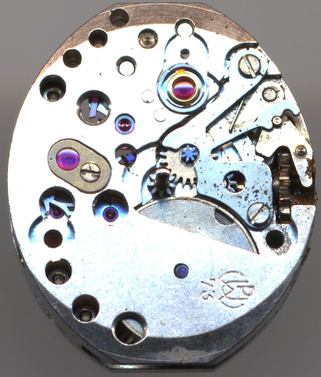 Es gab sowohl eine Version mit Schraubenunruh und der seltenen Monorex-Stoßsicherung, als auch eine mit Nickel-Ringunruh und der ebenfalls eher untypischen KIF Trior-Stoßsicherung. Ansonsten ist es wie praktisch alle Formwerke dieser Größe konstruiert. Auf der Zifferblattseite kann man noch die Aussparung für eine andere Unruhlagerung (beispielsweise ohne Stoßsicherung) erkennen, so daß davon auszugehen ist, daß dieses Werk schon Mitte des letzten Jahrhunderts konstruiert wurde, als Stoßsicherungen noch nicht allgegenwärtig waren. Dafür spricht auch die Tatsache, daß auf der Zifferblattseite noch die alte PUW-Punze verwendet wurde.