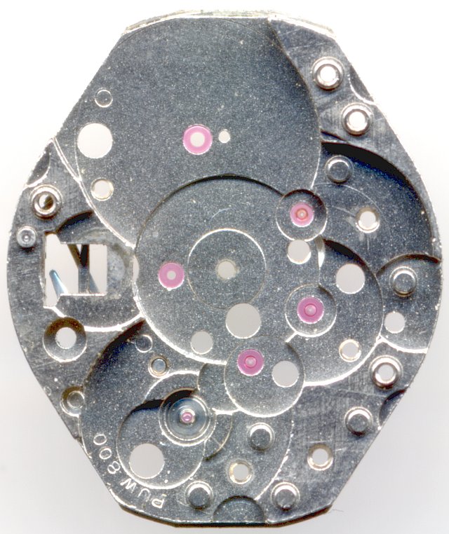 Mitte/Ende der 70er Jahre kam das PUW 800 auf den Markt. Es ist ein Damenuhren-Formwerk mit direkter Zentralsekunde und es besitzt eine ungewöhnliche Gesperr-Konstruktion.