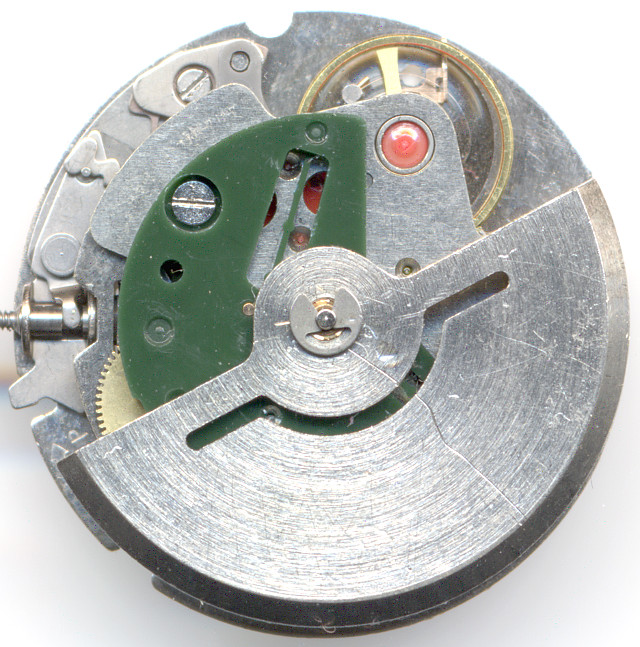 Der Automaticmechanismus besteht aus sehr wenigen Bauteilen, dem achsengelagerten Rotor mit festem Zahnrad, einem Schwingtrieb und zwei Reduktionsrädern: