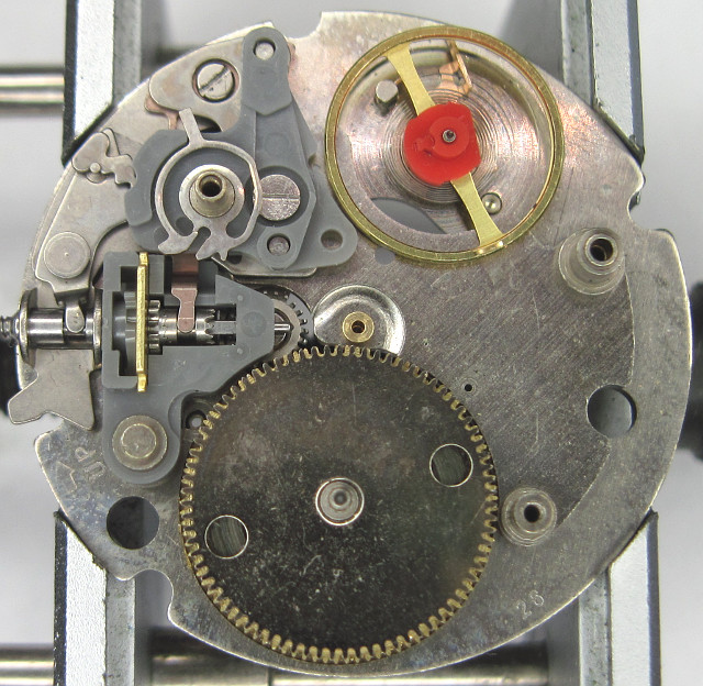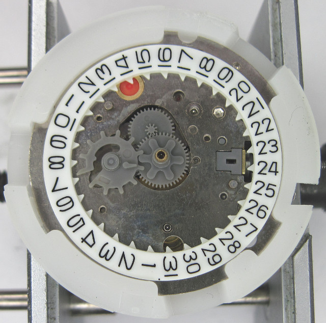 Auf der Zifferblattseite befindet sich der Datumsmechanismus, der mit ganzen drei Plastikrädern auskommt und trotzdem eine vollwertige Tag/Datumsanzeige inklusive Schnellkorrektur des Datums realisiert. Chapeau!