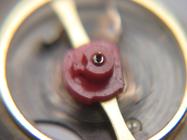 Leider bilden bei diesem Werk ausgerechnet die billigsten Bauteile die Hemmung: Ankerrad, Anker und Unruhfinger bestehen nur aus rotem Kunststoff, welcher leider mit der Zeit entweder spröde oder (wie beim vorliegenden Exemplar) zu weich wird. Damit ist eine relativ kurze Lebensdauer leider vorprogrammiert.