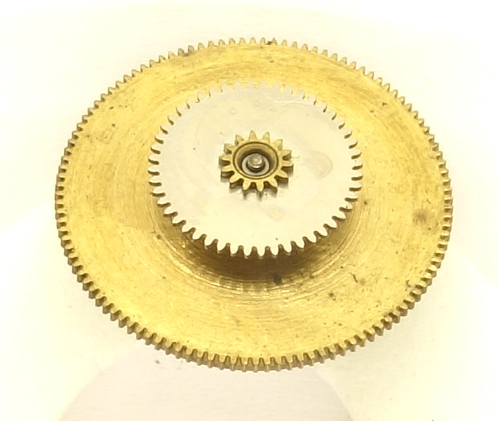 Das Stopp-Minutenrad ist direkt mit dem Federhaus verbunden und wird, wenn die Stoppfunktion angehalten ist, lediglich gebremst, indem der untere Doppelhebel (auf dem Bild vorher bei 1 Uhr zu sehen, im Normalfall allerdings weiter eingekuppelt und fast direkt an der Werksachse zu finden) gegen das Stoppherz drückt und damit die sehr leicht ausgeführte Rutschkupplung dieses Rads anhält. In der Praxis funktioniert dies aufgrund der hohen Fertigungstoleranzen nur bedingt, oft wird das Rad zu früh, oder zu spät angehalten.