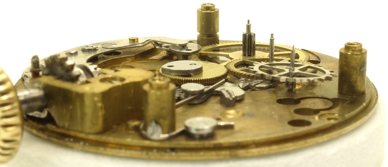 Interessanterweise verwendet das Rego 147 bereits einen Kupplungsaufzug, gut zu sehen bei 3 Uhr. Der Winkelhebel ist werksseitig montiert und wird mit einer fliegend gelagerten Feder in der gewünschten Position gehalten. Die Montage dieser Feder, die unter der großen silbernen Abdeckung liegt, läßt jeden Uhrmacher fluchen!