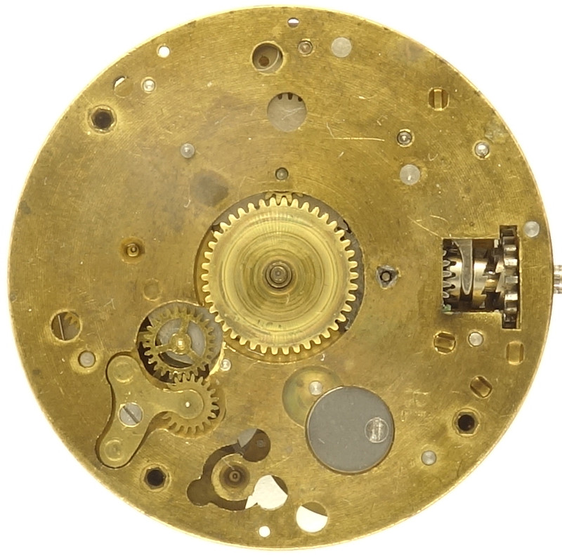 Auf der noch leeren Zifferblattseite erkennt man sehr gut die beiden Räder auf dem Federhaus, die mit selbigen über eine Rutschkupplung verbunden sind und gleichzeitig Minutenrad und Stundenrad antreiben. Ein eigenes Wechselrad ist daher nicht nötig.