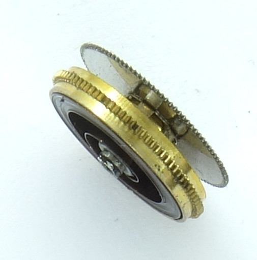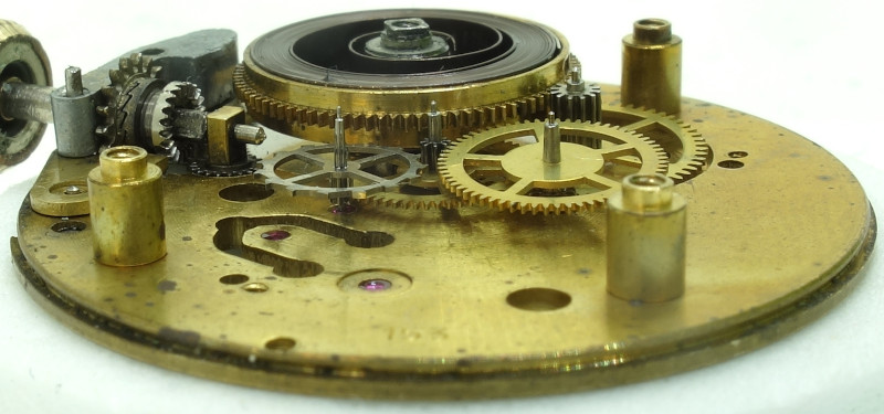 Wie bei jedem Roskopfwerk, so besitzt auch hier das Federhaus zifferblattseitig ein doppeltes Zahnrad, welches mit dem Federhaus mittels einer Rutschkupplung verbunden ist.