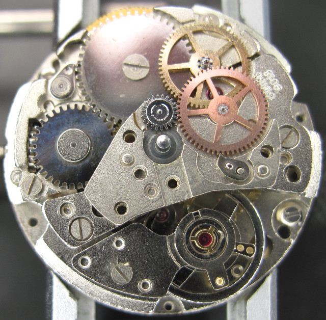 Der Automaticmechanismus besteht aus zwei großen Untersetzungsrädern, von denen das im Kraftfluß erste mit einer Sperrklinke gegen Zurückdrehen gesichert ist. Außerdem ist ein fliegend gelagertes Wechselrad im Eingriff mit dem Rotor, das dafür sorgt, daß bei Rotordrehung im Gegenuhrzeigersinn der Kraftfluß zum Federhausgesperr erfolgt, im Uhrzeigersinn und bei Handaufzug der Rotor dafür frei drehen kann und entkoppelt ist. Ergo ein einseitiger Aufzug.