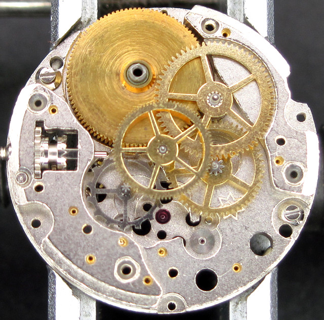 Der Räderwerksaufbau ist sehr modern, mit direkt geführter Zentralsekunde und zifferblattseitig indirekt angetriebener Minuterie. Die vier Werksräder sind dabei unter einer Brücke gelagert, in welche die runden Lagersteine in viereckige(!) Aussparungen gepreßt wurden. Vielleicht nicht die allerschönste Lösung, aber rationell und kostensparend war es allemal.