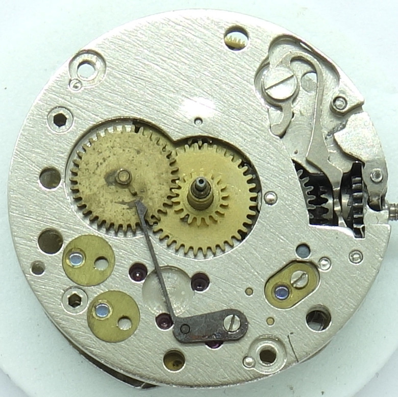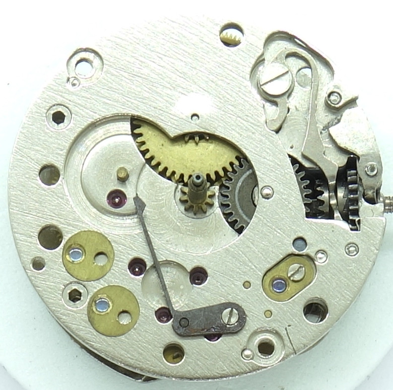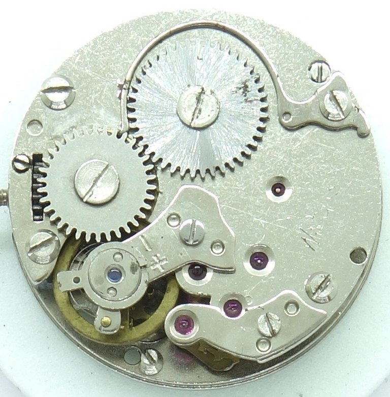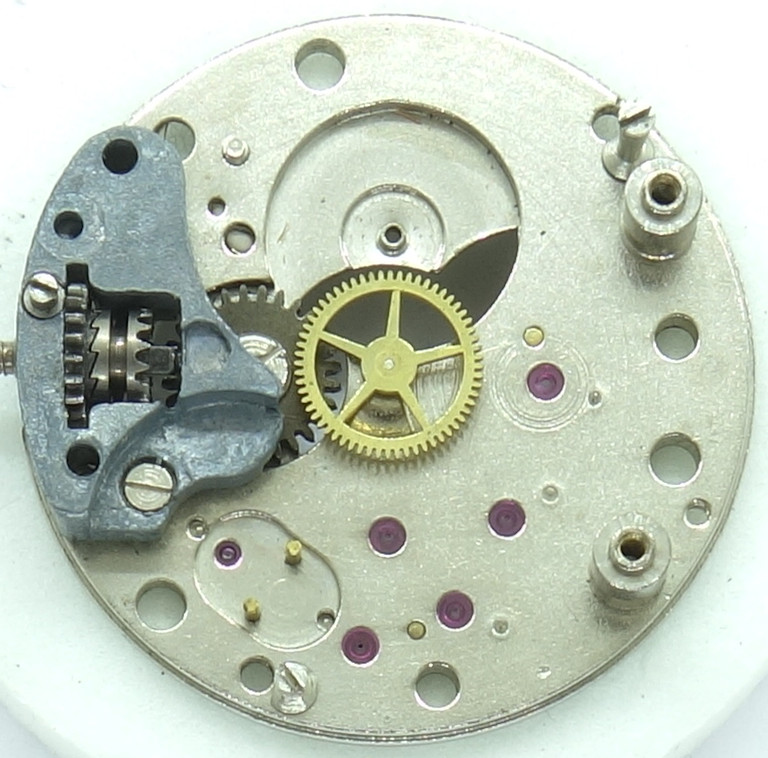 Auffällig ist das leere Lager bei 6 Uhr. Ob damit eventuell eine dezentrale Sekundenindikation vorbereitet und von einer anderen Kalibernummer realisiert wurde, ist leider unbekannt.