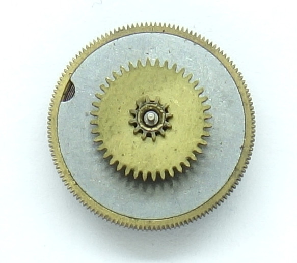 Das Stundenrad wird über das obere Rad auf dem Federhaus angetrieben. Es treibt über ein niedriger verzahntes Rad auf seiner Oberseite das Datumsschaltrad an, das alle 24 Stunden eine Umdrehung durchführt.