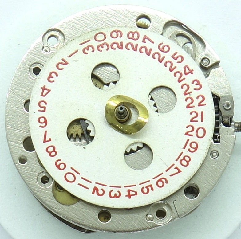 Der Kalendermechanismus ist sehr einfach gehalten, das Datumsschaltrad greift in den innenliegenden Zahnkranz der Datumsscheibe ein. Gleichzeitig sorgt eine Feder dafür, dass das Datum nach dem Schaltvorgang wieder sauber einrastet.