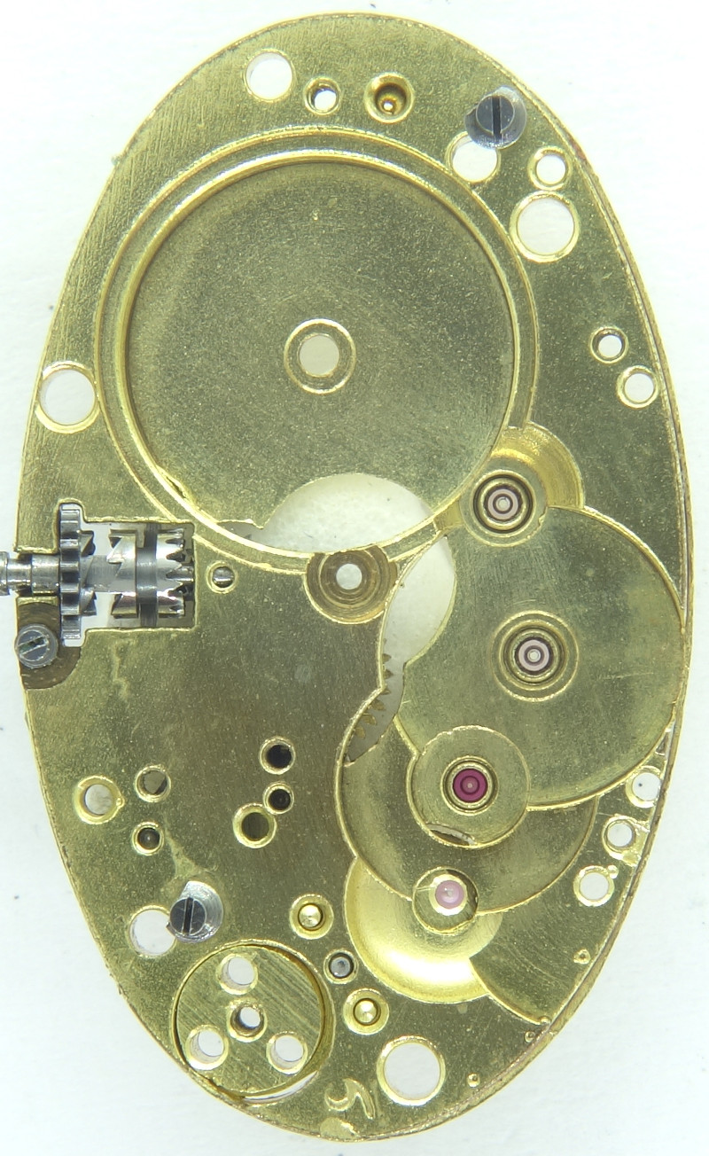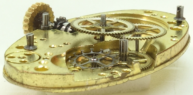 Der Räderwerksaufbau ist typisch für Zylinderwerke, besitzt aber eine Besonderheit, und zwar befindet sich der Zahnkranz des Kleinbodenrades oberhalb des zentralen Minutenrads.