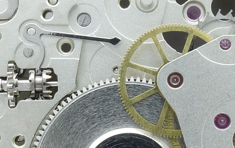 Typisch für Vorbild und Klon sind das recht grobe Kronrad und das deutlich feiner ausgeführte Sperrrad. In letzteres greift das letzte Untersetzungsrad des Automaticmechanismus ein.